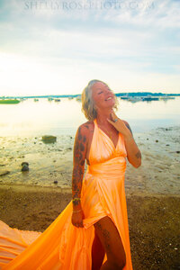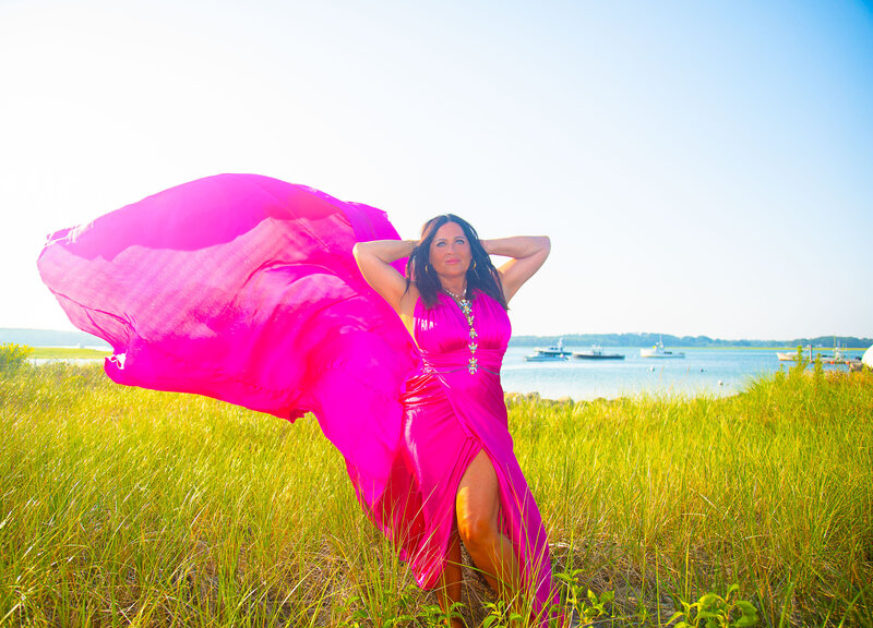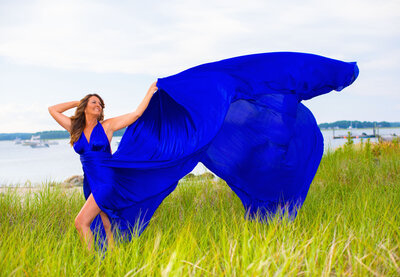 Flying Dress photoshoot including airbrush makeup and hair curling. Pine Point Beach
